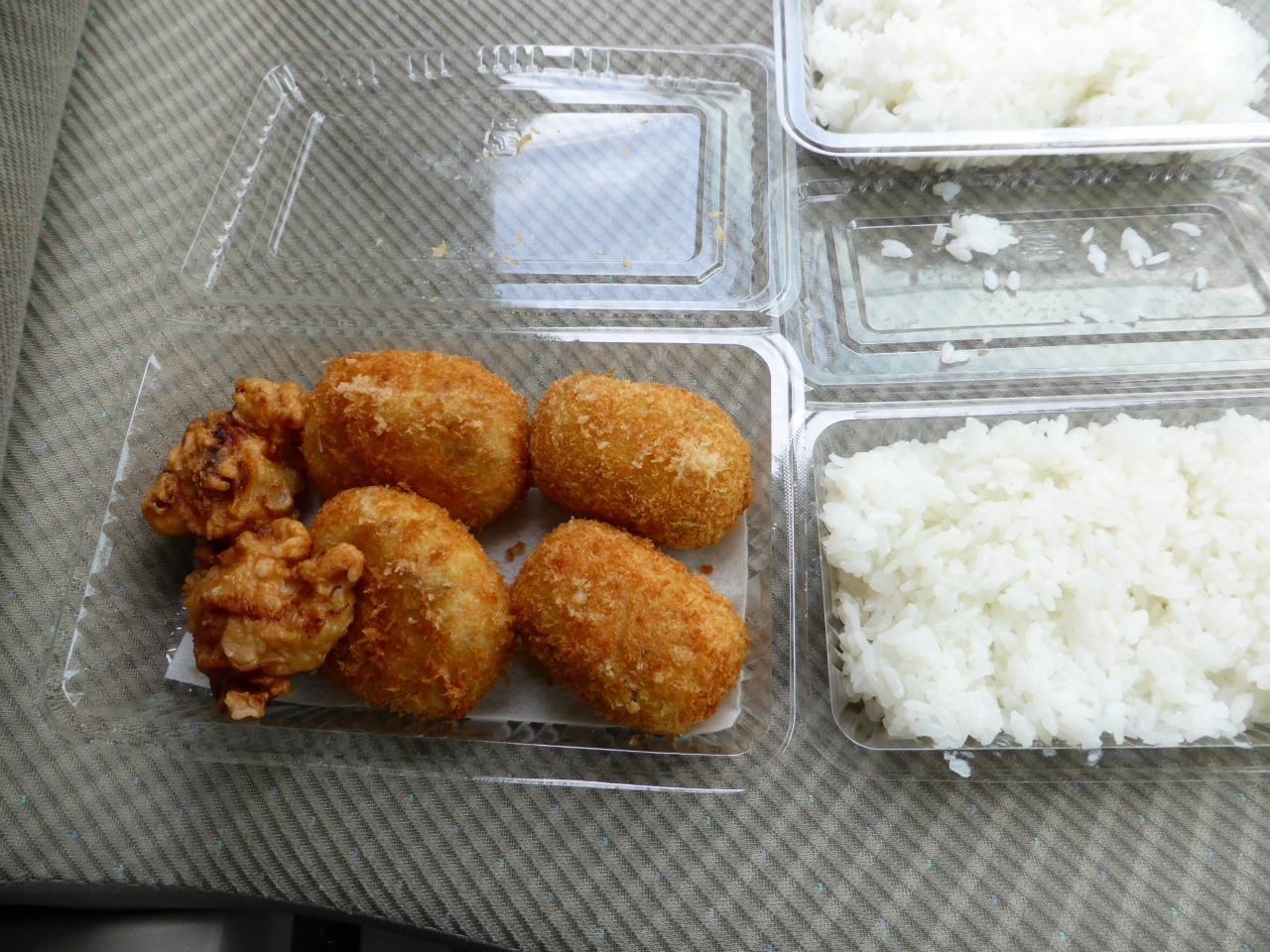 空港から約1時間で到着。店内に入るとずら~と弁当が並んでいると思ったのでが、全くありません。副菜のお惣菜がいくつかあるのみ。店員のお母さんと話をすると、所謂弁当という体裁のものを買うためには事前に予約が必要だったようです。ただ揚げ物ならすぐできるという事で、野菜コロッケ、肉コロッケ、唐揚げをそれぞれ2個。ご飯とお惣菜は好きなものを詰めていいというので、セルフであるものを詰めました。