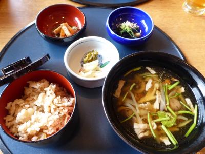 深山きのこ汁膳はきのこ汁、山菜炊き込みご飯、小鉢付きです。炊き込みご飯は薄味で丁度いいのですが、ちょっと山菜が少なすぎました。