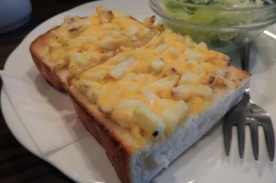 ●タマゴトースト 厚切りの食パンの上にタマゴサラダがたっぷり乗り、軽くトーストしています。モーニングとしては食べ応えもあり十分な美味しさ。コーヒーは注文が入ってから豆の挽き、ドリップしているので香りも良く、朝からゆったり。