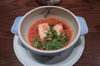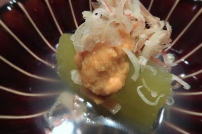●冬瓜と雲丹の冷製 塩味は抑えてあっさりですが冬瓜にもしっかり味が含んでいます。そこに雲丹という取り合わせも絶妙。帆立と浅利の出汁が旨味たっぷり。