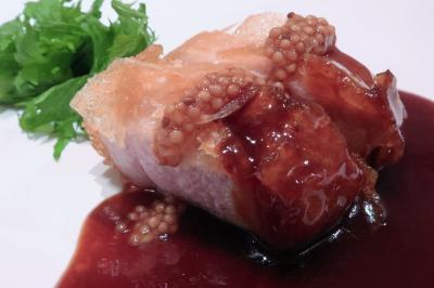●黒酢酢豚 十勝どろぶた使用。酢豚というにはあまりにも上品。低温で揚げているので肉質はしっとり、厚みはありますが歯で噛みきれるやわらかさ。黒酢にエゴマのマスタードがアクセント。