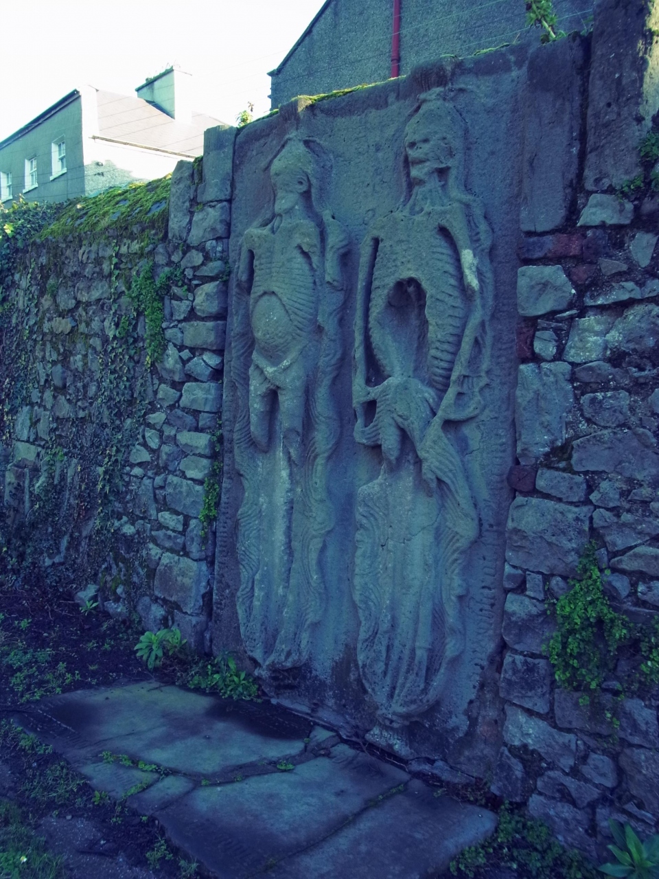 有名な骸骨姿の夫婦のレリーフは、墓地の奥の方の壁にあります。