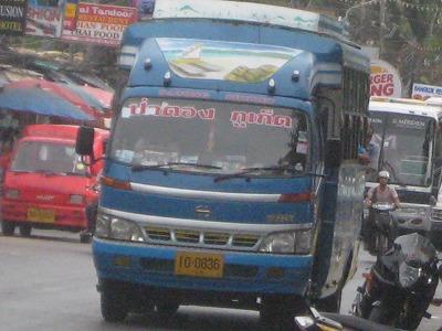 各ビーチからプーケットタウンまでソンテウ(乗合いバス)があります。停留所はないので手を上げてバスに合図すると止まります。プーケットタウンにあるイタリアレストラン「サルバトーレ」に行くのに利用しました。パトンの海岸通りを渡ってバスが停車しやすい場所に待っていました。荷台の両サイドと中心に長椅子があります。海岸通りはゆっくり走りますので外の様子が見えて観光と思えば結構良い乗り物です。プーケットタウンまで15km。25B/1人です。
