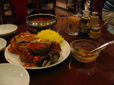 上海料理屋で12月初旬でも上海蟹があった。雄・雌いっぱいずつを半分にしてもらい両方を食した。結構癖になる味で、皮をむけばむくたび蟹肉が出てくる。上海蟹で有名な陽澄湖の産。コクがあって、蟹本来の味を楽しむことができた。ただ、店は雨風降りしきる中、お客さんが来る度にドアから寒風吹きすさび料理に集中できなかったのは大誤算。他に蒸し鶏とチンジャオロースーを食べたが、味はまあ可も無くレベル。次は行かないなあ。もっと早い時期に別の店で上海蟹いただきたいと思います。お値段は安かったよ。