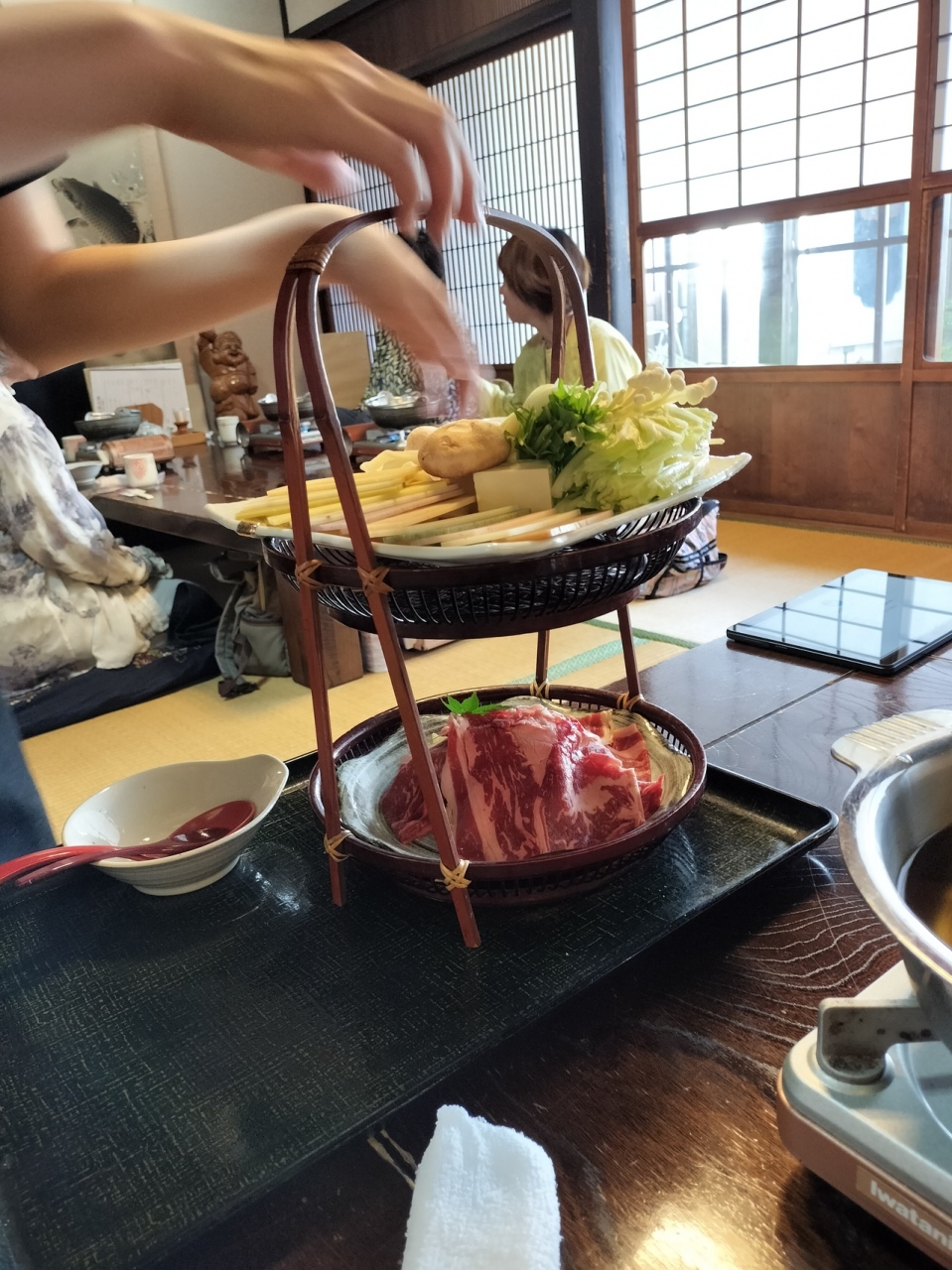 薄いお餅のしゃぶしゃぶと牛肉のセットを頼みました。野菜から先に鍋に入れて12種類の薄いお餅をしゃぶしゃぶして食べます。夏の暑い時期でしたが美味しくて完食しました。