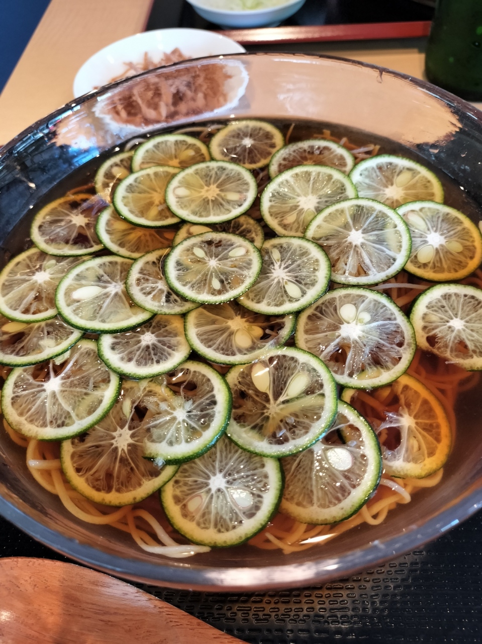 いつも行くお蕎麦屋さんです。こちらは細いお蕎麦でとても食べやすく気にいっています。いつもは天ぷらがついたお蕎麦ですが今回はすだちが一面に乗ったお蕎麦にしてみましたが、夏の暑さにはピッタリで美味しいです。