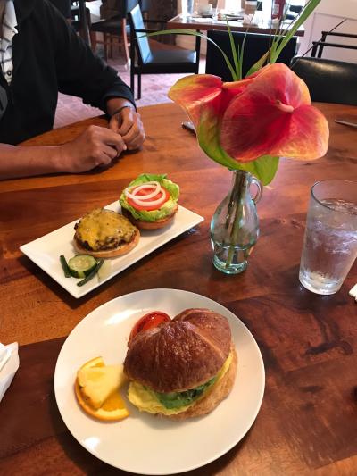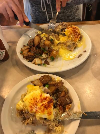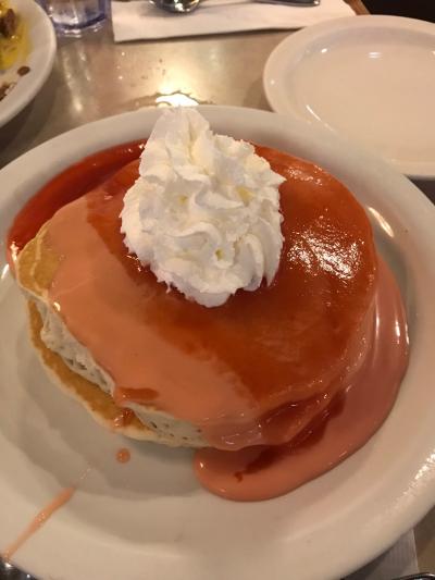 朝食からランチまで混み合います。私たちは2人ではグアバソースのパンケーキとカイルアポーク(pulled pork) のエッグベネディクトを注文してシェアしました。パンケーキは2枚か3枚かと聞かれて、もちろん2枚にしましたが、それでも1/4くらいしか食べれませんでした。グアバソースは甘酸っぱくパンケーキはふわふわです。エッグベネディクトは卵が生は嫌なので、よく焼いてとリクエストしたら、半熟くらいでちょうど良かったです。ポークも美味しくてパンケーキよりもベネディクトのほうが好きでした。- 旅行時期