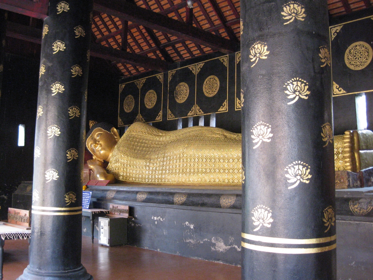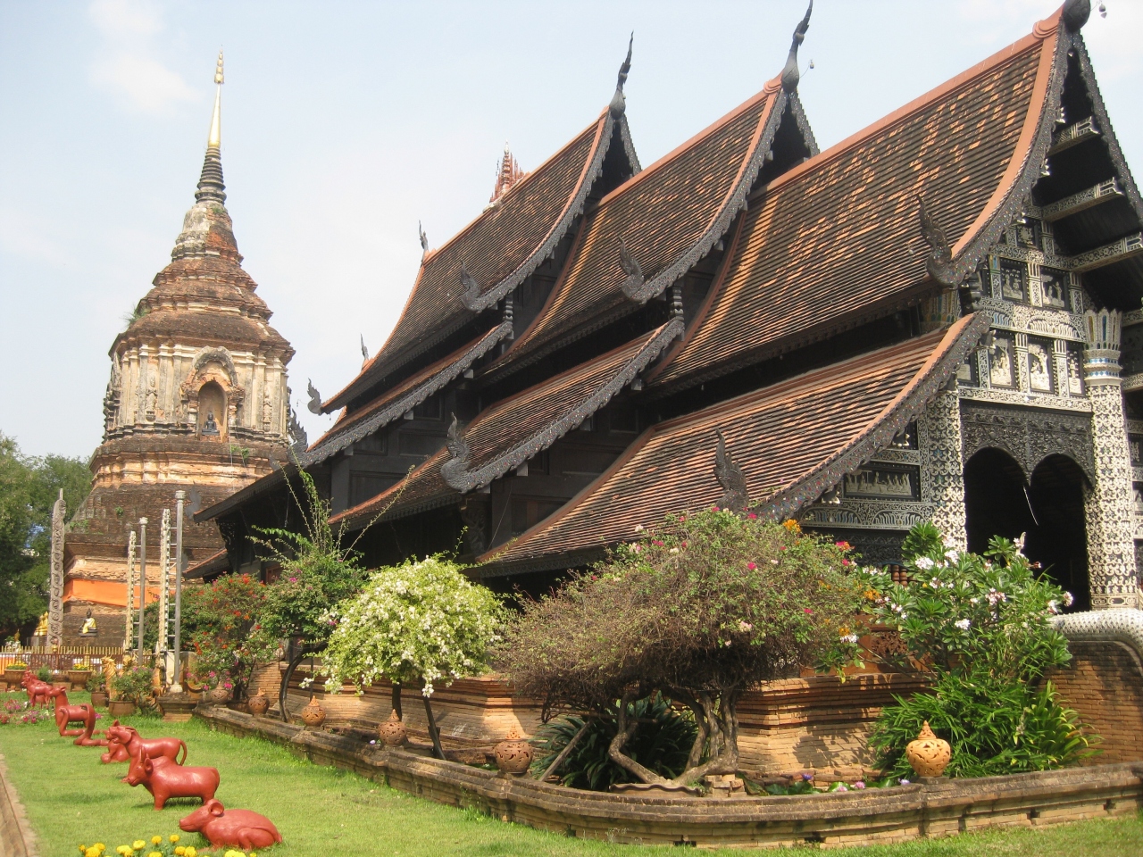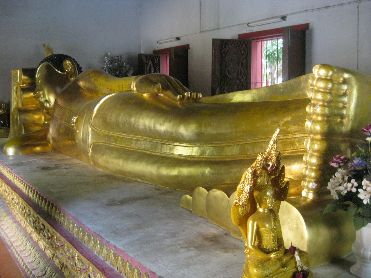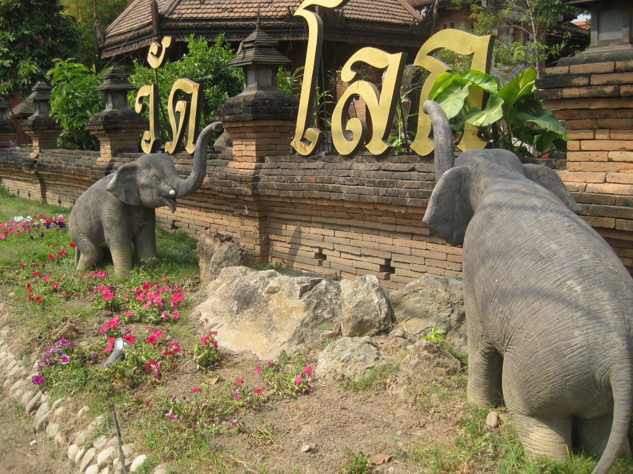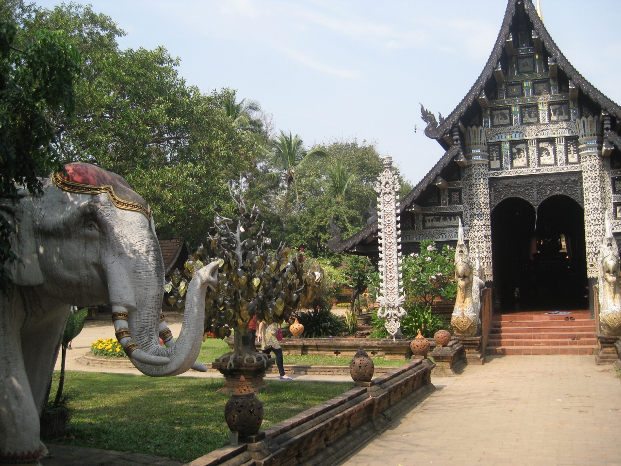 入り口に象さんの置物がお出迎え~と、まるで、え?これがお寺の入り口?と思えるほど可愛らしいお寺です。お堂の入り口にも左右に白い象さん。中は絵掘りが飾ってあり芸術的。