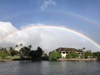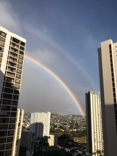 1月~2月は雨季のシーズンですが、確かに雨も降りますが、ほとんどが霧雨のような感じで、しかも風が強いので、傘をさしてもまさに霧雨のシャワーを浴びているようで、傘よりはレインジャケット、または薄手のパーカーが役に立ちます。そして一日のうちに晴れ、曇り、雨、とコロコロ変わる感じです。またそのくらい暑いのかと言うと、昼間は晴れればビーチで泳げる暑さで、あっという間に日焼けしてしまうくらいの日差しですが、木陰に入れば涼しく、日が落ちると風の向きによっては寒く感じることもあるので、長袖もあったほうが良いと思います。それでもこんな天気のお陰で虹が沢山見られますよ~!そして日本の一番寒い時期にハワイで過ごすのは最高の贅沢だと思います。