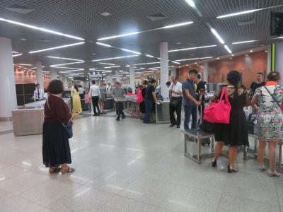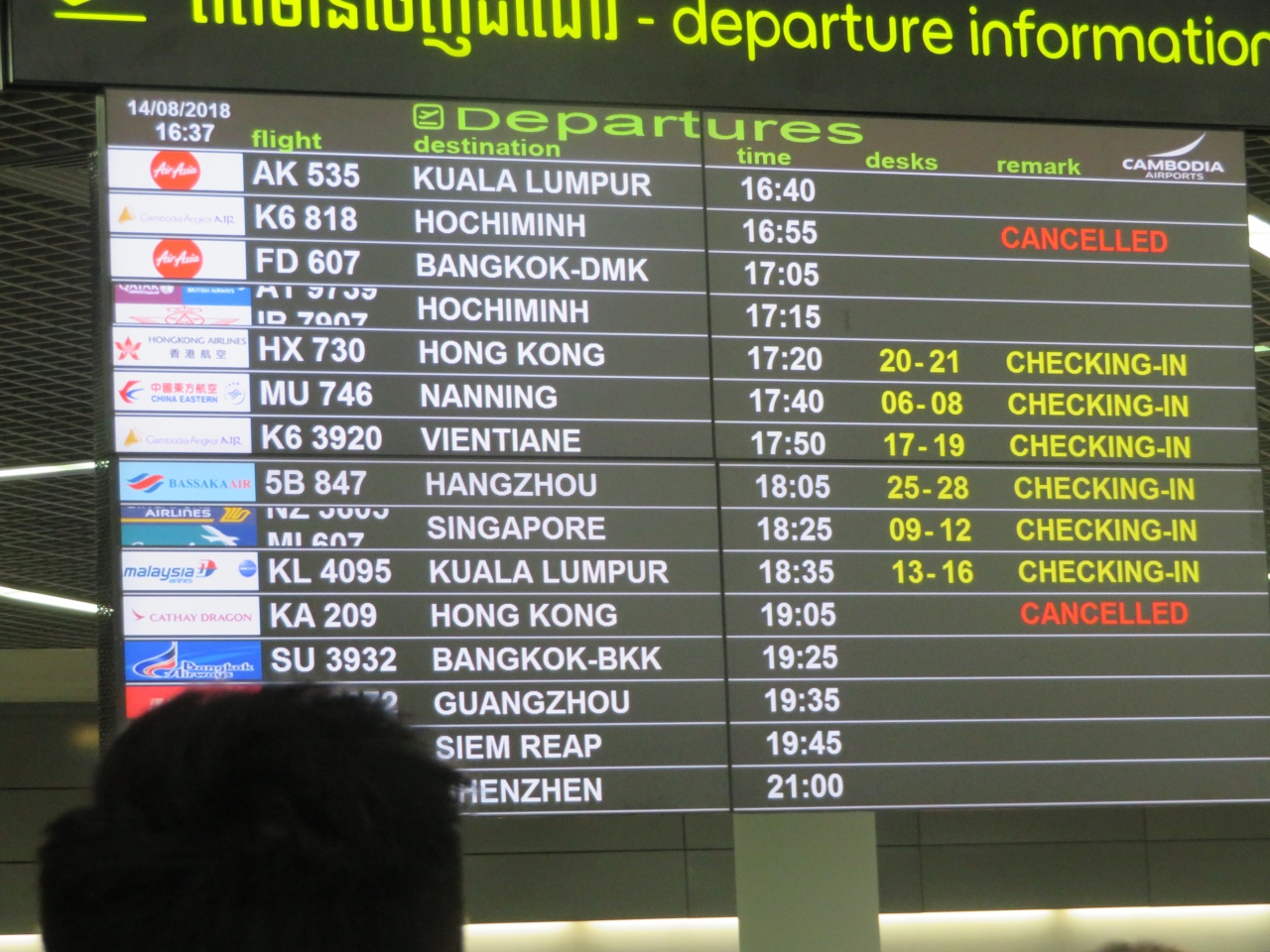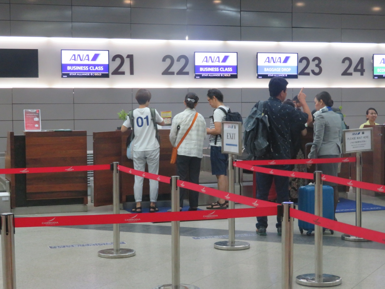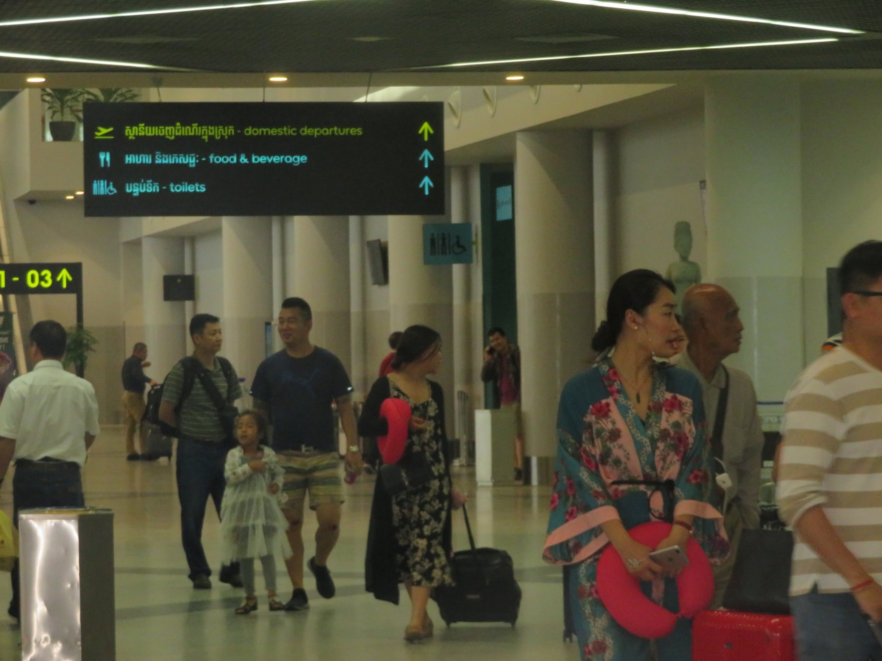 古くて暗い感じでしたが、水洗トイレだったし、空港自体はまあまあだったと思いました。入国する時ツーリストビザというのを一人30アメリカドルで取得しないといけません(日本でも取れますが高いです)。クチコミではそうでもなかったですが、私達の時はやたら中国人のパスポートをいっぱい持った現地ガイドさんみたいな人が何人も、横口の方から割り込みらしき事をしていて何気なくすーっと、カンボジアの係官から先にもらっているように見えました。(??…)私達は本当に一番最後の方になってしまいました。1時間以上かかった気がします。こんなもんかな~て感じでした。…出国ロビーは本当に何も無く、軽食が出来るスタンドが2か所ほど有るだけで、お土産屋さんとか全くありませんでした。入国・出国ロビーの間にフードコートみたいなのが有り、そこにはハンバーガー屋さんや日本の吉野家、中華料理店等があり、食事はできました。超地方空港よりはるかに規模の小さいような出国ロビーに早めに着きましたが、インフォメーションでANAのチェックイン窓口が何時にオープンするのか尋ねると、基本、カウンターは出発の3時間前でないとオープンしないと教えてくれました。5時間も前に到着していたので本当に時間を持て余してしまいました。チェックインを済ませて搭乗券をもらえば2Fの保安エリアに行けます。エリア内にはビジネスラウンジも一か所あり、スターバックスや免税店、それなりのレストランなども何か所かあり、時間もつぶせるのですが、いかんせん3時間前でないと、そこにたどり着けません…。仕方ないのでフードコートで時間をつぶしてました。保安エリアに入ったら、それなりに楽しかったですが…。ANAの出発時間に集まってるので免税店も半分以上は日本人のような感じでした。