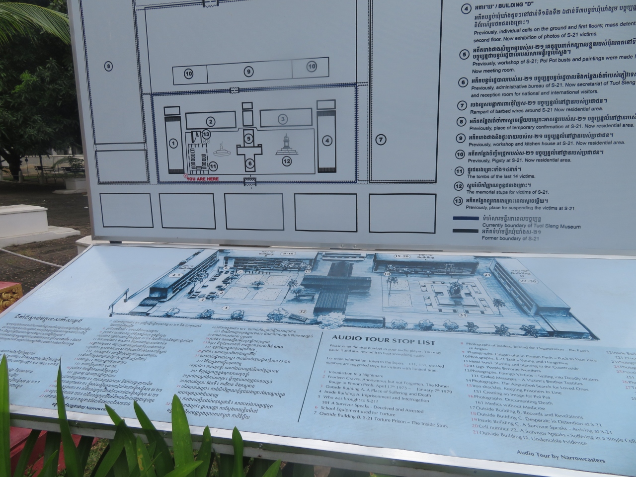 カンボジアなのでやはり避けては通れないと思って行きました。カンボジア人は本当に心が広い人達だと思いました。ポルポトの200万人以上の自国民虐殺は、内容は知らなくても、その言葉だけは誰でも聞いた事があると思います。このトゥールスレンは、当時住民が虐殺される前に収容されてた数ある刑務所みたいな所の1つでした。その前は学校だったので面影が残ってます。拷問や非人道な尋問の様子が写真や本物の無数の骸骨等が展示されてます。ポルポトは病死、ここの所長だった人は今も終身刑中との事、信じられません。過去の暗い歴史に正面から向き合ってるカンボジア人の寛容さに驚かされました。…当時の生き残った子供や収容されて生き残った数少ない人、数名が、この博物館の一角で自分の経験した事を本にして1冊$10で観光客に売ってました。たくましいです。…私達には理解するのに苦労する日本語ガイドがいたので(でも一生懸命でにくめません)、オーディオサービスは利用しませんでしたが、各国語用意されてましたので、それを聞きながら回るのもいいですね