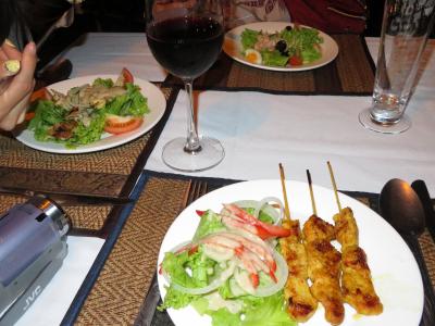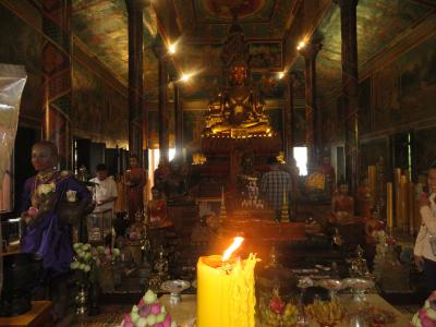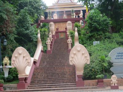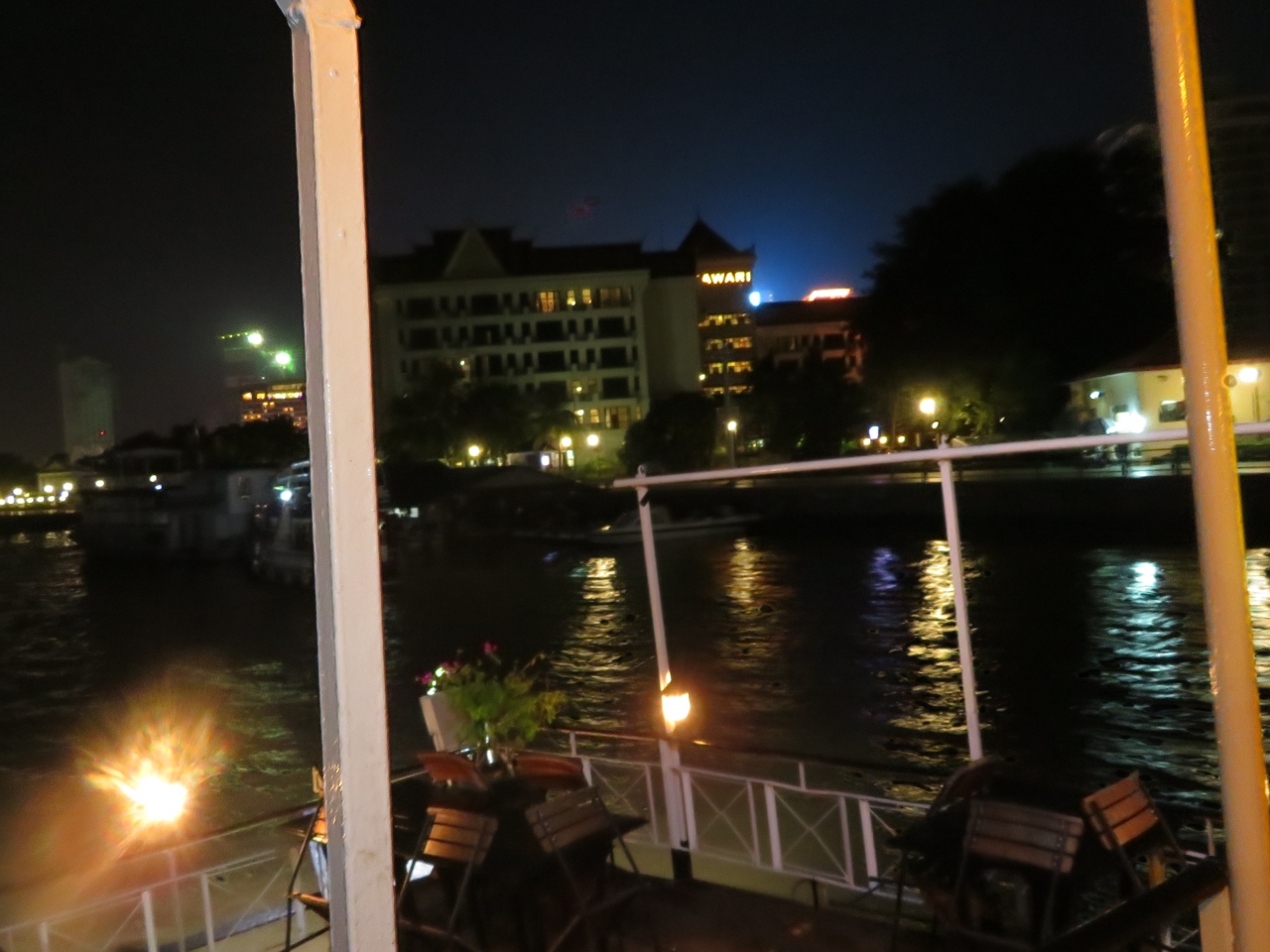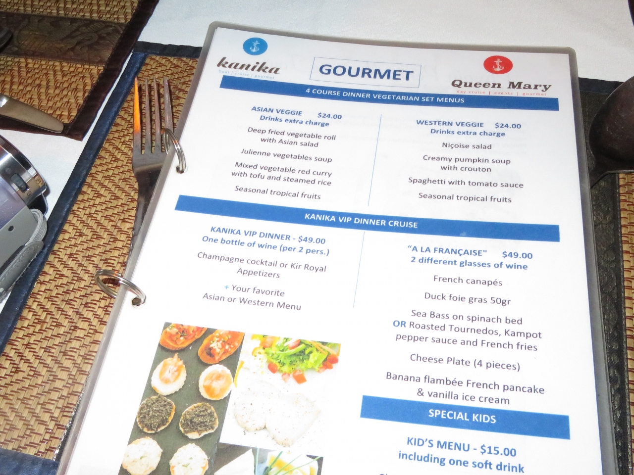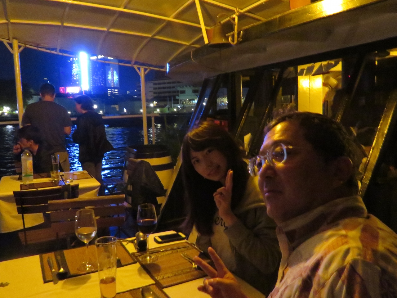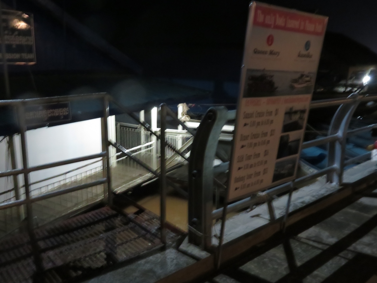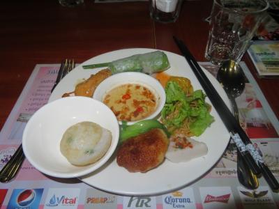 トンレサップ川を遊覧する観光ボートです。宿泊したヒマワリホテルの裏の遊歩道の所に乗船場があり、他のホテルも遊歩道沿いに結構あるので観光客にはとても便利だと思います。プノンペンに到着した日の夜、ホテルでちょっと休憩したあと、一日目のスケジュールにぴったしでした。ディナーの料金に乗船代が含まれてるので、選んだお料理によって代金が違ってきます。私達は多分飲み物込みで一人$40位でした。1時間半位の時間で川を行ったり来たりします。王宮や回りのホテル、川沿いなどがライトアップされていて、とてもきれいでした。川風が気持ち良く、カーデガンが欲しいくらいでした。昼間見た川は真茶色でしたが、不思議と臭いはありませんでした。