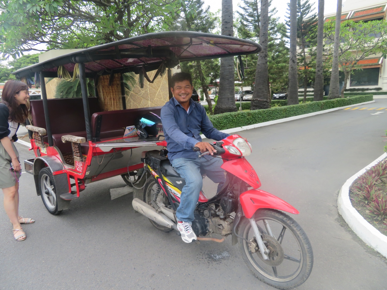 治安には気をつけろとさんざ言われてましたので、それなりにきをつけてました。プノンペンはトゥクトゥクがどこに行っても溢れていて客引きしてました。英語がほとんど伝わらないので、女性だけで利用するのはとても勇気がいる事だと実感しました(ほぼ止めた方が無難)。私達は主人がいたのでそれなりに気を強く持って利用出来ましたが…。帰国日、ホテルをチェックアウト後、荷物をフロントに預け、今回の旅行で初めてトゥクトゥクを利用して自分達だけで観光しました。出かける前にフロントで、つたない英語でやっと情報を聞きだし、1回片道$5が相場だと確認し、ホテル前で客待ちしてたトゥクトゥクを拾いました。(本当はホテルフロントでチャーターしてもらおうとしたのですが、私の拙い英語では無理と思ってやめました。)ホテル→ロシアンマーケット→イオン→ホテル…結局そのトゥクトゥクに3回乗りました。チャーターしたつもりは無かったので降りた度に$5払おうとしましたが、待ってるのでひまわりホテルに戻った時にまとめて支払ってくれればいい…私達もホテルのとこで拾ってるので他よりは安心・相手も客引きの競争が激しいので、決まったお客がいれば好都合…そう思ってるふうで、話がまとまり、乗り込みました。最初はスッゴク快適で、私がカメラとビデオを出してトゥクトゥクから撮ろうとしたら、ダメダメ、それは危ないからしまって…と注意してくれました。荷物も中の方にまとめて…と、すっかり信用してしまいましたが、夕方ホテル前に戻って、3回乗ったので$15を渡し、チップもあるよと話してると、相手の顔が変わりお金が足りない…と言い出しました。きっぱりと言うので日本人のお人よしが出てしまい、良くしてもらったのでチップは$5渡そうともってたので、本当に私が数え違いをしてしまったのかと、それを渡しました…が、まだ足りない…と言い張ります。初めておかしいと思い、思わず相手からお金を全部むしり取り、一枚づつかぞえ直しはじめたら、途中で、わかった・わかったと言い出し、$20全部とって、さーっと行ってしまいました。初めから$20渡そうと思ってましたが、本当に気分が悪くなったしまいました。外国では油断大敵!!