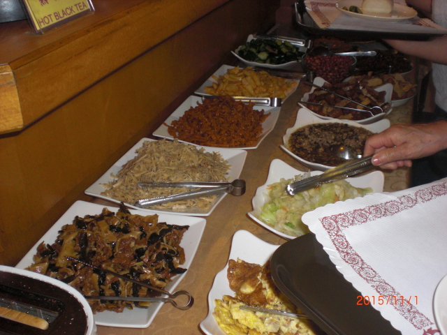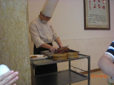 王仏禅寺のすぐそばに有りました。北京ダックが食べたくてツアーのガイドさんにお店を紹介してもらい、予約もお願いして行ってきました。お昼のコースで一人180元(約3600円)、飲物は別代金です。とても賑わっていてお客さんでいっぱいでした。ダックをテーブルの脇でスライスしてくれます。甘いみそは無くなると足してくれて、思いっきり、本場の味を楽しむ事が出来ました。自宅に持ち帰る人用のために、道路に面してテイクアウト専用のカウンターが有りました。こちらの方もお客さんがたくさん並んでました。