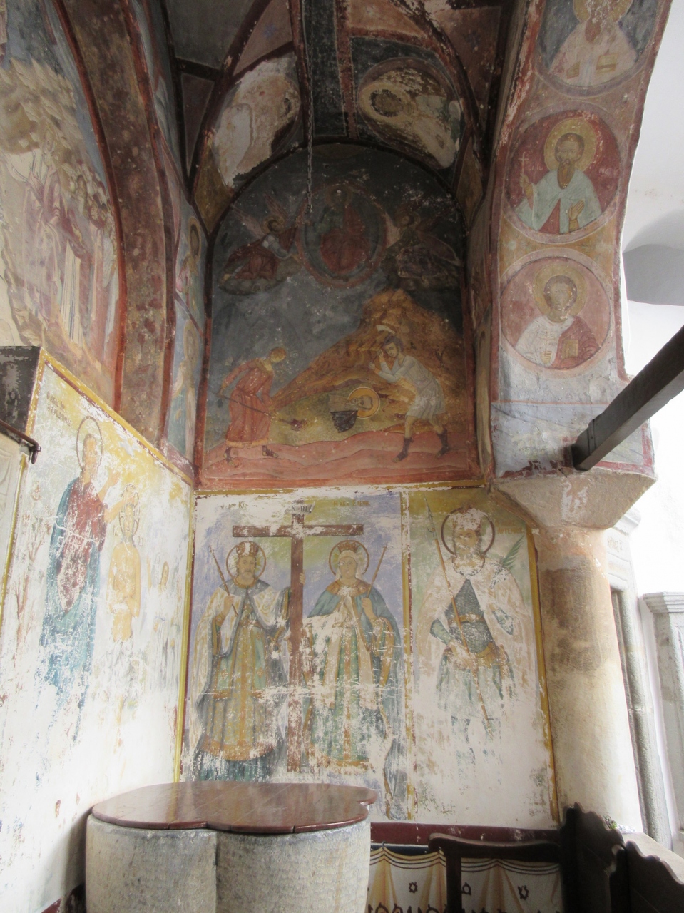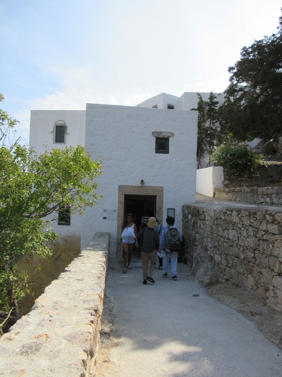 最初は島を見るだけと言っていた家内も一緒しようということになり、東京から来た会社員夫婦と4人で同乗、当方2人でチップも入れて6ユーロ払って、山の上の聖ヨハネ修道院迄タクシーで行った。聖ヨハネ修道院は下からみても要塞のようで威厳があるが、内部も1088年建造というが、壁面の絵にも歴史が感じられ、素晴らしい。