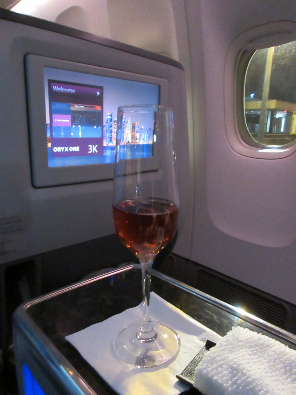 20:40搭乗して先ず、シートが水平ベッドになることを確認。続いて、Lansonのロゼシャンパンを戴く。