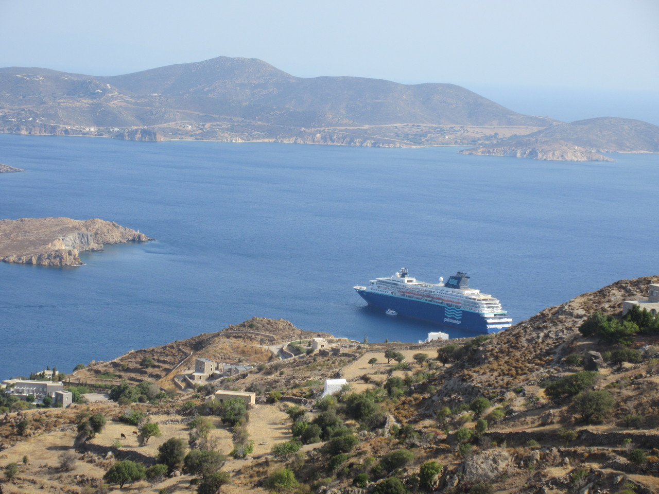 為、歩きにくい。足元を注意しながら歩く坂道から見るエーゲ海と空の青さ、クルーズ船
