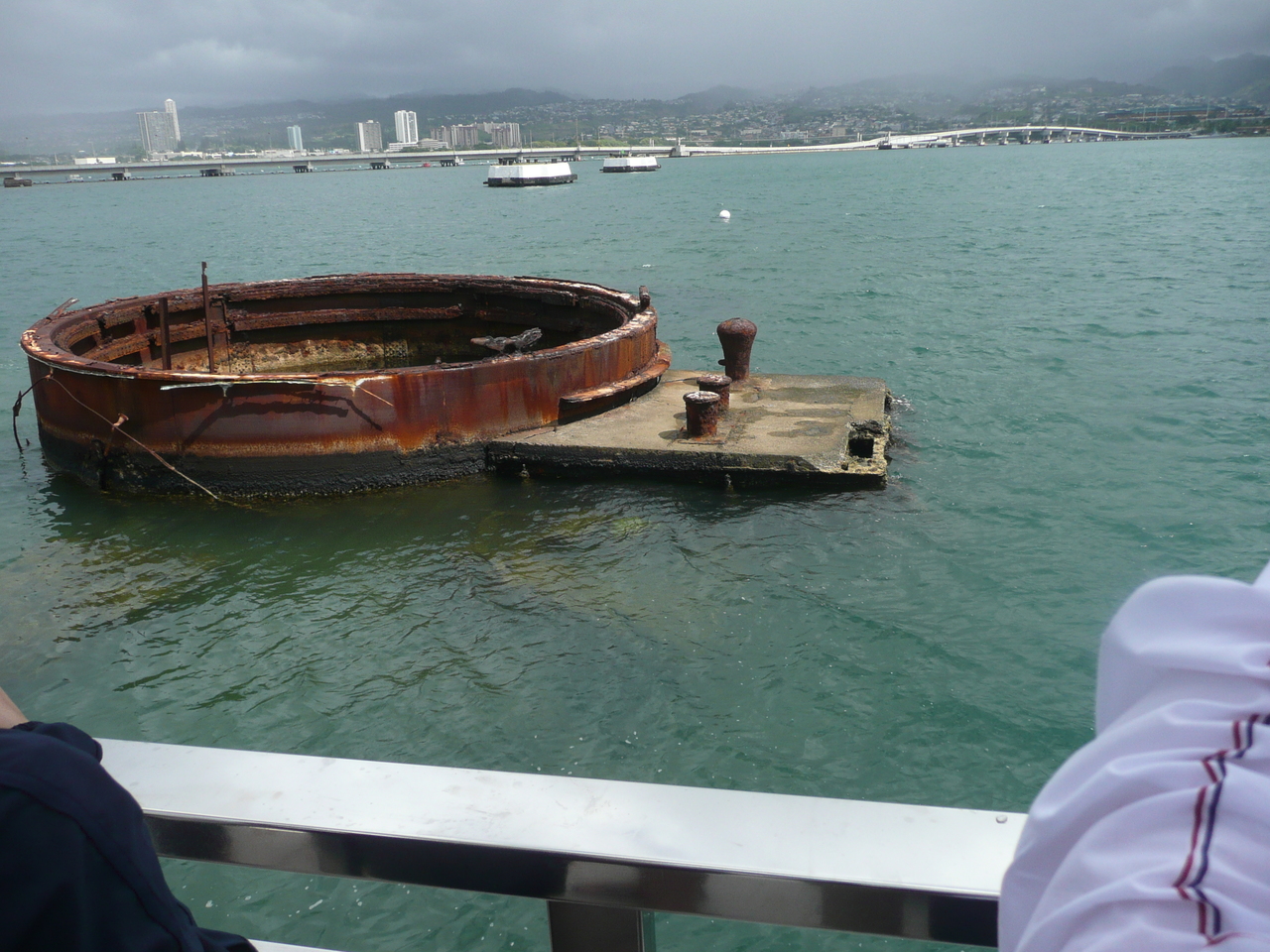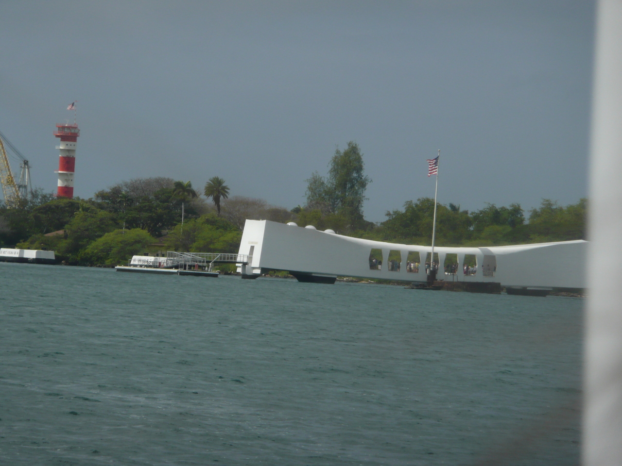 6、映画の後、50人位が乗るボートに乗りアリゾナ記念館に入館。沈んでいる船の上から煙突等が見える。ここで現地人は煙突等の写真を遠慮なく撮っていた。此れから想像するに写真を撮っていけないのは犠牲者の名前を刻んでいる祭壇の部屋のみの様だ。(解釈が違っておれば済みません。)祭壇の部屋には犠牲者の全名前が刻印されており、この前で神妙に黙祷を捧げた。犠牲者にもアメリカ本土に悲しんだ家族が居たと聞き、戦争の愚かさを実感した。ボートで記念館に来た一割位が日本人観光客であったが、特に変な目で見られた様な気はしなかった。