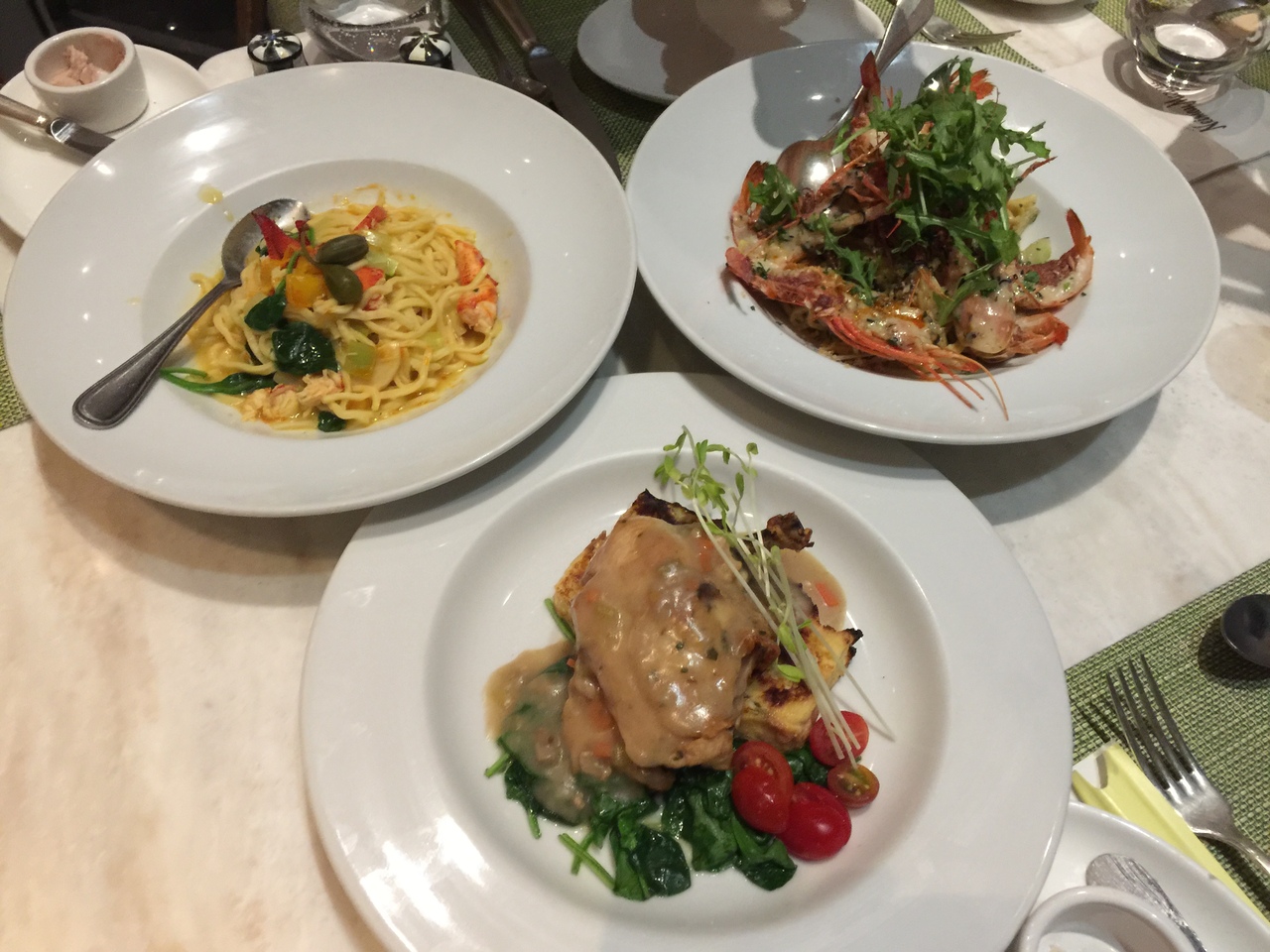 おすすめに従い苺カクテル(甘さ控えめで美味)で乾杯から初め、アヒサラダ&貝柱と豚腹のソテーを注文、メインはロブスターリングイネ&甘エビとイカスミ(?別途)のパスタ、ロ-ストチキンを6人で分けて美味しく頂きました。