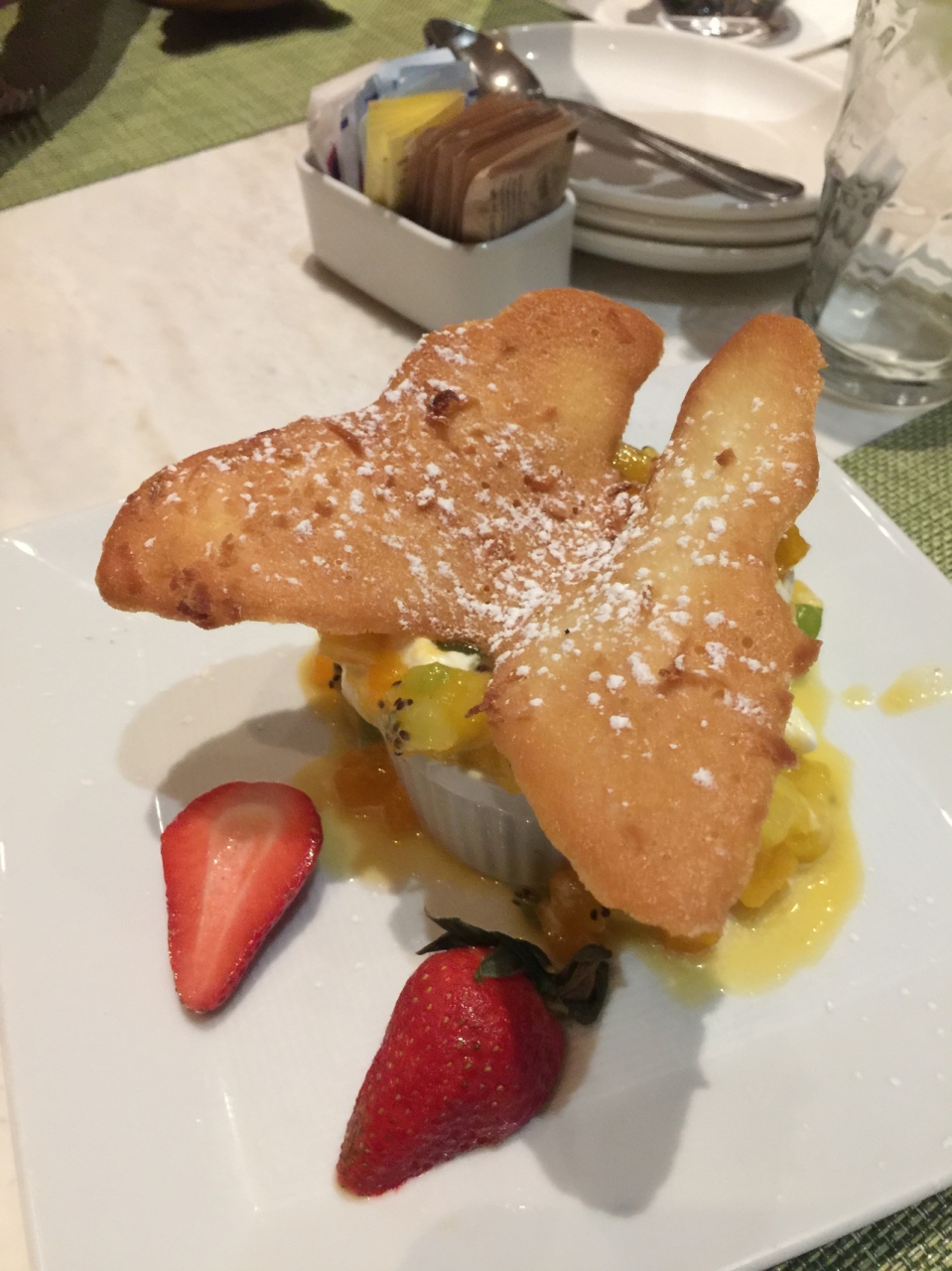 デザートmenu を貰い、リリコイケイキとカプチーノを頼み、リリコイケイキが思ったより大きかったが、デコレーションも味も満足できるものでした。義兄のみカプチーノではなくコナcoffee を要求したところ、他のtable の皆が頼んのか、切らしたとのこと。私がclaimしたところコナcoffee ブレンドを特別にserveしてくれました。very good,マハロ!