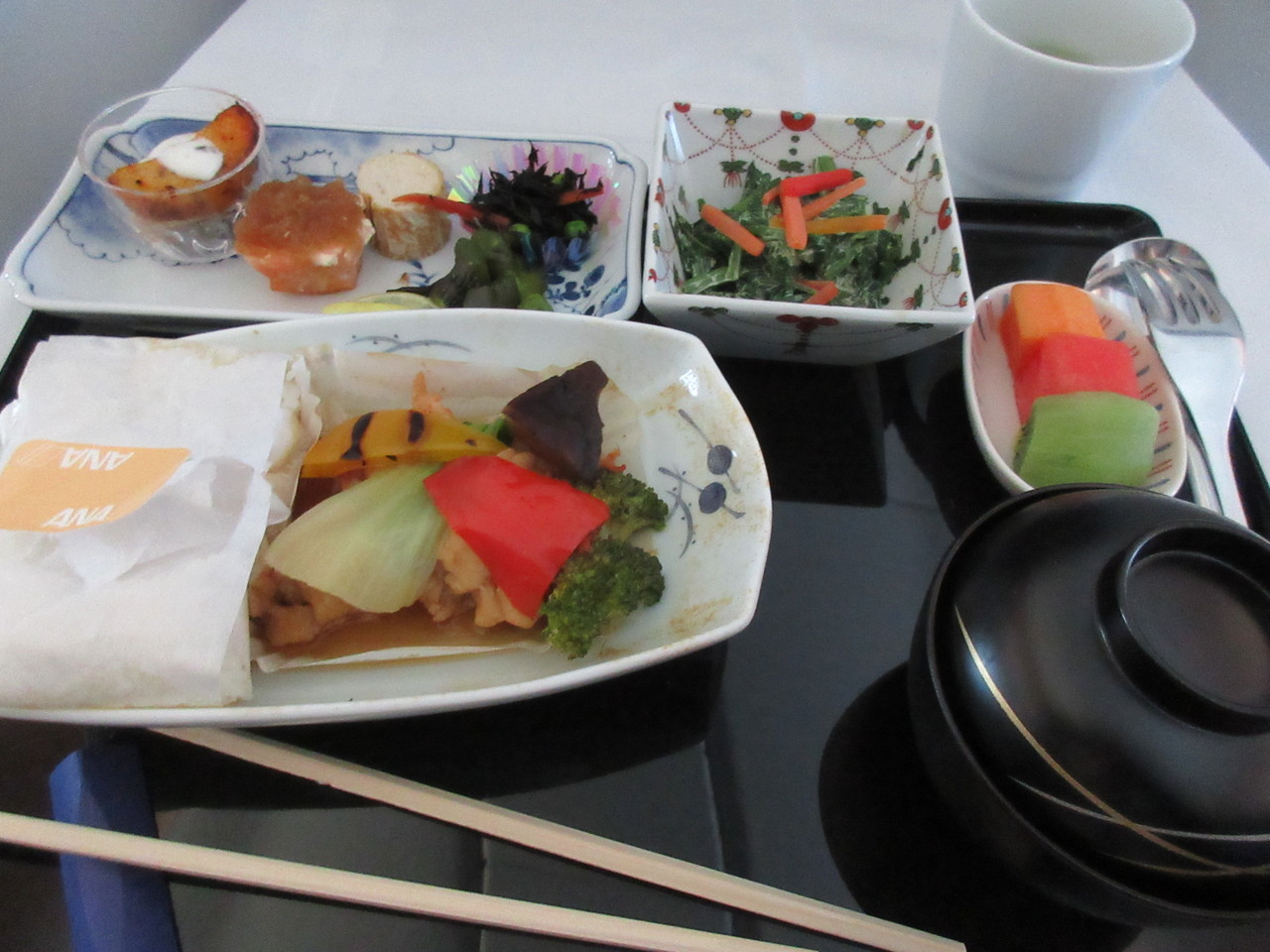 ANAのB788利用はシドニー&ワイキキに次いで3回目であるが、乗るたびに良くなっており、今回のシート1-2-1,1-1-1 で2列目の私のシートは真ん中の一人で、シートは180度のFlat Sheet (Bed)になっていた。Welcome DrinkのシャンペンもChampagne Collet Brut Art Deco であり、EmiratesのMoet Chandonより高級品の様である。おつまみも上品。Dinnerを和牛か和食のどちらにするか考えていると、CAが和牛が不足しており、和食を薦めてきた。ANAのビジネスでもそういうこともあるのかと思いつつ、和食をOKした。ずわい蟹と春菊の和え物と帆立貝は非常に美味しかったが、全体的に見た目を凝った和食と思える。Desertにはアミューズを頼んだ、これも凝っているが、少しすっぱかった。映画新作Transformerの日本語版を見ながらこれらの食事を楽しむのも日本の航空機の醍醐味か? 旅行案内には飛行時間約10時間20分と書いてあったが、9時間で着くとの事。気流の加減で変わるようだ、最悪の条件を旅行案内には書いているのか?着陸2時間前をJMT1時と計算しなおして、少し寝て1時に
