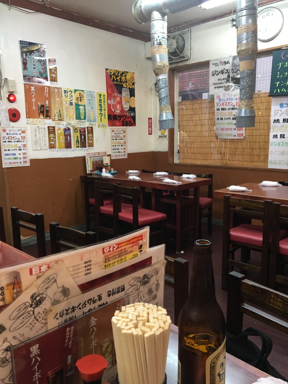 入口近くの席に座ったが、ジンギスカンメニューがなかったので聞くと、ジンギスカンを注文する場合は奥の換気扇が付いている席のみだった。