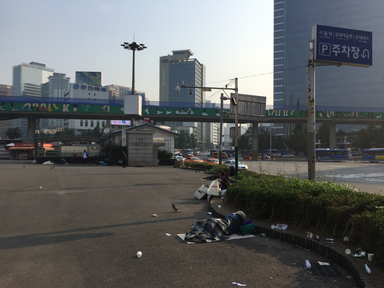 早朝だったからか、駅舎周囲には路上生活者が多数。路上には酔って寝ている人が多数。