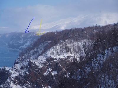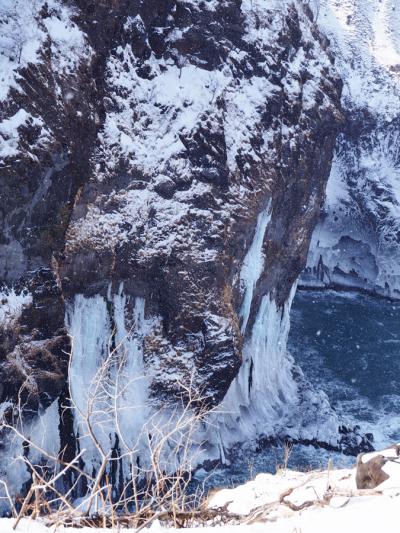 知床の原生林スノーシューツアーに参加して、歩き廻りましたが、新雪が深くて、1人では迷ってしまい、同じところをグルグル廻ってしまいそうでした。雪の下がどうなっているのか、分からない場所では、やはりガイド先導が良いと思いました。フレペの滝からもう一つ先の岬にあるのが、この「男の涙」と呼ばれる滝です。寒々とした景色にぴったりでした。冬の雪景色が、美しさを一層高めてくれました。この先の岬は象の鼻と呼ばれる岬があり、そこから右手方向に、五湖の断崖が見えます。