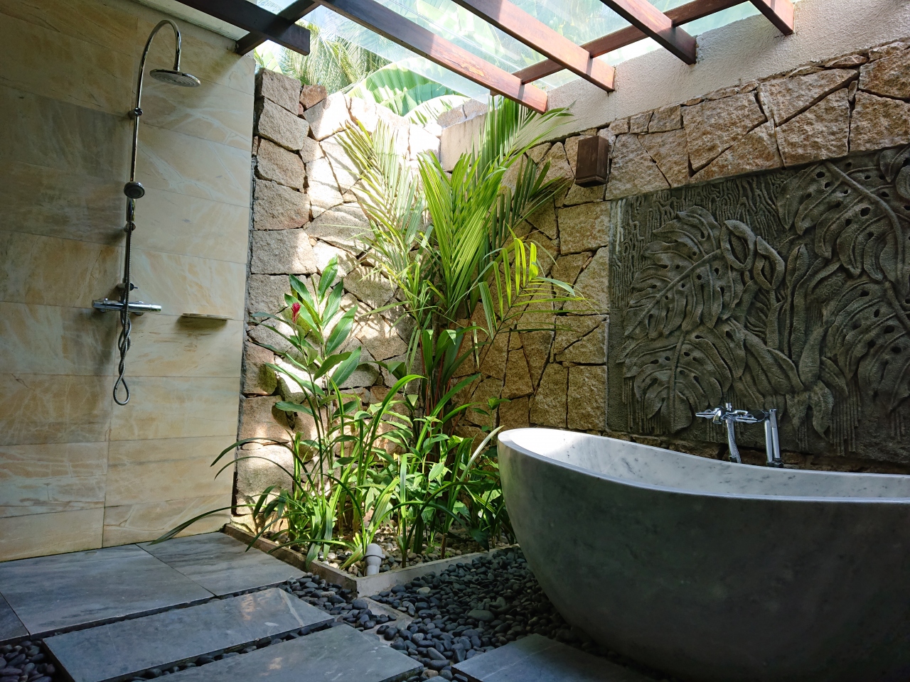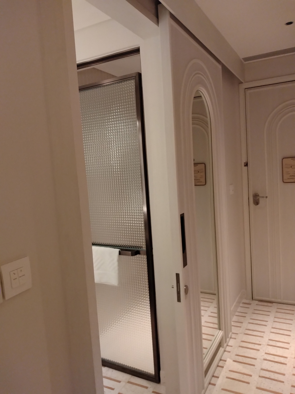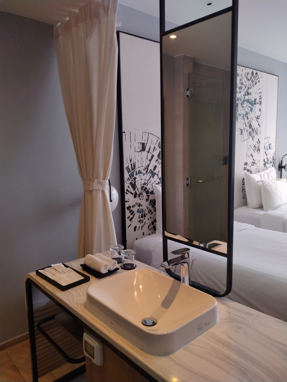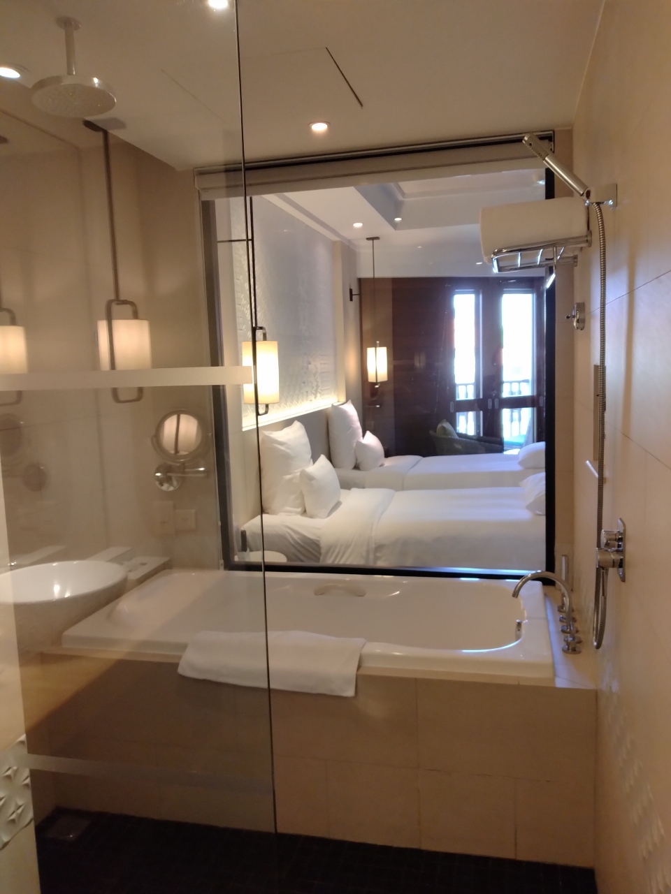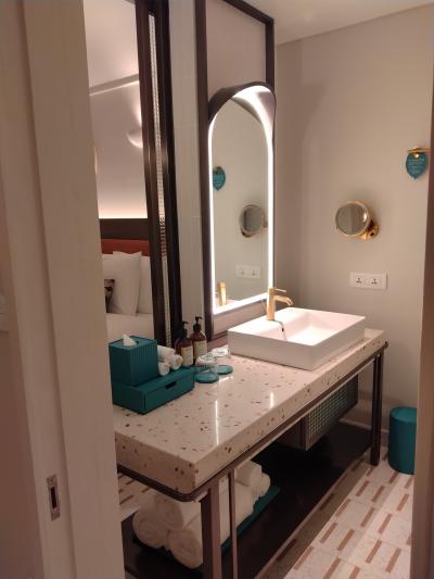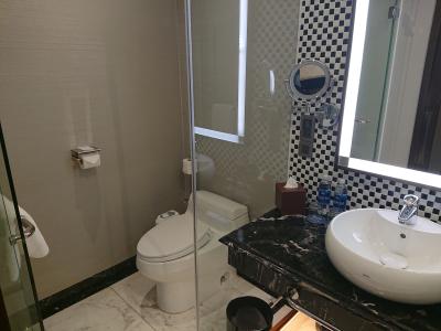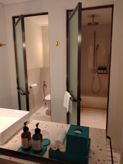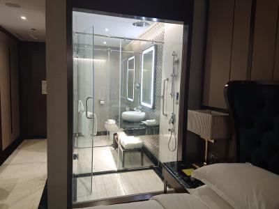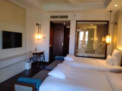 部屋は、バスとトイレに分かれていたのは便利ですが、入口直ぐの所にガラス張りであるので、そんなに開放感がなくても良いのになとは思いました。ベットルームとの間にはカーテンがあるので、使用する時に閉める事は出来ます。