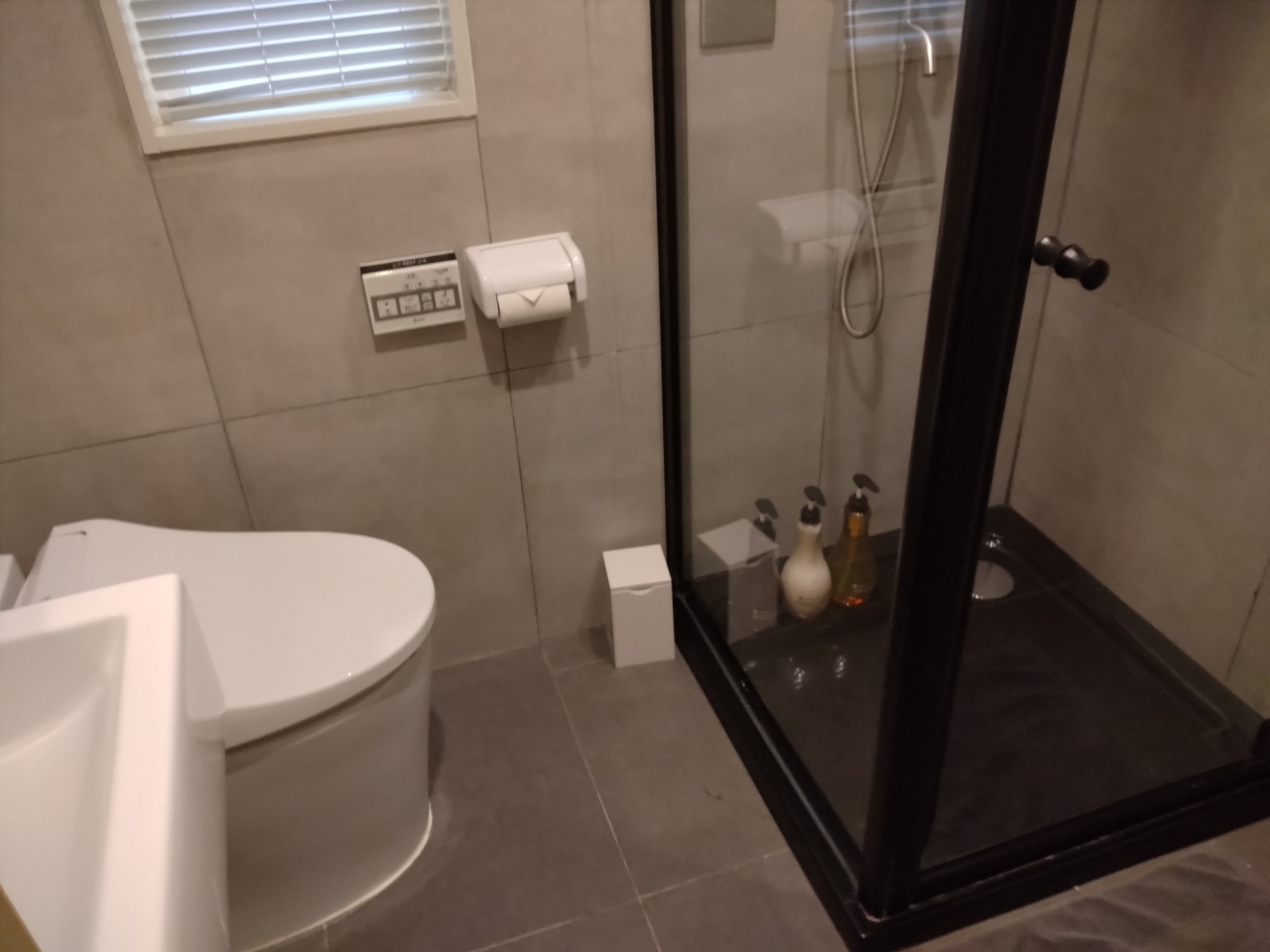 バスルームに、シャワーとトイレスペースがあり、バスタブはありません。