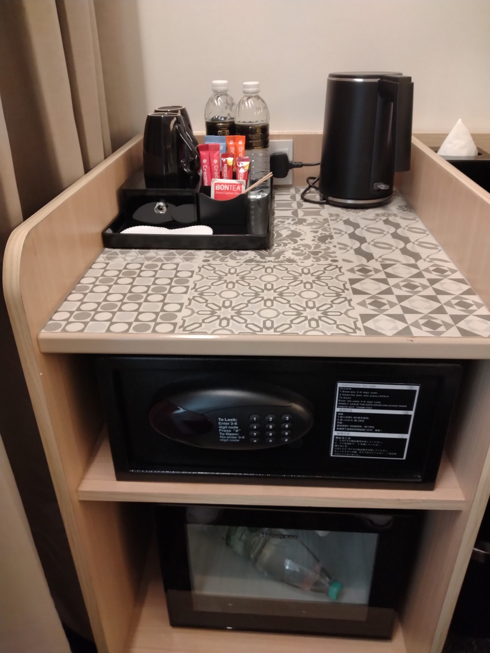 冷蔵庫や湯沸しポット、金庫もあります。