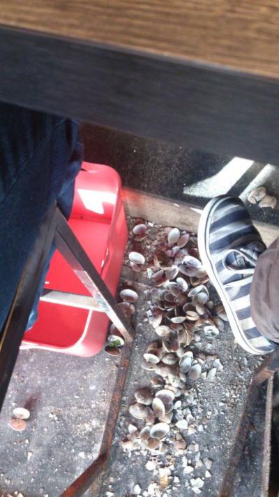 お椀からはみ出すぐらいのアサリの量です。食べた後貝殻は足下にポイポイ捨てるシステムなんです!!!!!