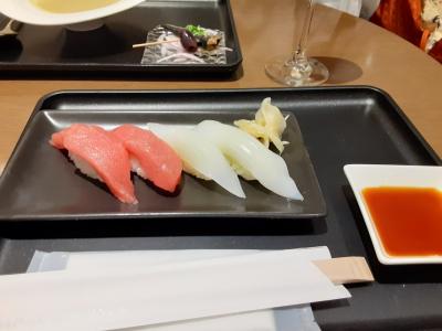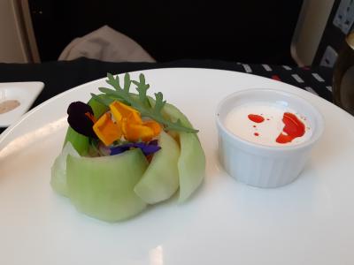 コロナ後、初の成田からの出国。スペースも広々とした席で、上質な時間を過ごせました。スマホでQRコードを読み取りメニューから、料理を注文する形式。その場で職人が握ってくれる寿司も健在で、堪能しました。シャンパンも2種類あり、飲み比べ。搭乗前から、楽しい時間となりました。