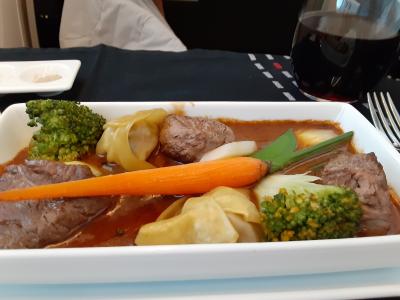 ちょうど夕食時間での利用で、飲食エリアに。すぐにスタッフがテーブルまで案内してくれました。テーブルも大きく、隣席までのスペースも空いていて快適。ビュッフェではなく、アラカルト形式で、メニューから選んで注文しました。料理の盛り付けも美しく、味も良い。これで無料というのが驚きな、大満足な経験でした。