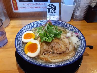 蛍池駅から徒歩3分ほど。土地感なかったが、ランチタイムで食べログで上位評価だったので訪問。平日お昼時だったがお客は疎ら。食券を買いカウンター席に。マグロ節ラーメンはとてもやさしい味。太麺ももちもちして美味しかった。同時に、あっさりスープが麺に伝わりきってない印象も受けたので、ちぢれ麺でも試してみたかった。