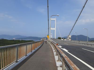 伯方島と大島を結ぶ橋。橋からは瀬戸内海の島々とともに、大三島の雄大な姿を望むことができました。他の橋と違いオートバイも併用とのことでしたが、自転車道が広く、また交通量も少ないので、全く気になりませんでした。