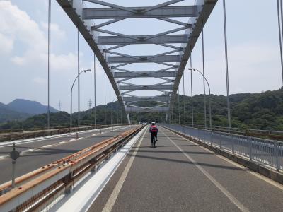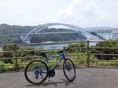 しまなみ海道のサイクリングで通る橋は、吊り橋ばかりの中、この大三島橋だけはアーチ形の橋で、アクセントとなっています。大三島側から、橋までのサイクリングロード途中には橋の全景を望める絶景スポットがありました。