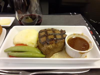 欧州域内線のビジネスクラスの利用です。座席は前方ではあるものの、席自体はエコノミークラスと基本同じです。ただ、3列シートの真ん中が荷物置き場になっていて、マスクをしていない人が多い中では、密を避けられ、少し安心。電源プラグが足元に備わっていたのも、コロナ前との変化点。食事は軽食ですが、ワインとともに楽しめました。