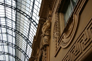 ドゥオモから、このガレリアを抜け、スカラ座にいけます。この3点セットが一度に観光できます。ガレリアは、天井高く、また壁には彫刻があしらわれ、素晴らしい雰囲気です。内部は、プラダなどのブティックや、レストラン、カフェ、雑貨屋が軒を連ねています。