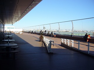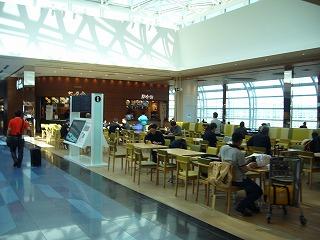 国際線ターミナルのチェックインカウンター奥のエスカレーターで5Fまで上がったところにあります。ウッドデッキ調の床も、眺望の気持ちよさと相俟って、良い雰囲気を演出してくれています。また日陰部分にはテーブルがあり、屋内にテイクアウト可能なカフェもあります。