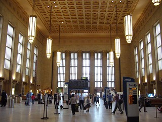 フィラデルフィア市の中心駅。アムトラックが発着し、ワシントン~ニューヨーク~ボストンを結ぶ特急列車、アセラエクスプレスも停車する。構内には、サンドイッチなども扱うファーストフード店/カフェもある。駅前にはタクシーも多数待機している。