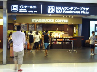 待ち合わせや時間調整に最適な場所にあると思います。チェックインカウンターの奥側にあります(手荷物検査より前)。メニューは、普通のスタバですが、出入り口や座席スペースの通路も広く、大きな荷物を持った人も通り易いように配慮されています。