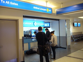 ロサンゼルス国際空港の国際線ターミナルでは、手荷物検査後に両替所があります。搭乗ゲートに向かう通路のところなので、全員が通る場所で目立ちます。レートは米国なので良くありませんが、免税店で使い切れなかったら、ここにも戻ってきて両替もできます。