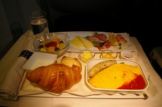 羽田~バンコクへのレッドアイ便(夜発・朝着便)を利用しました。ビジネスクラスで、シートは古いタイプ(シェルフラット)でした。搭乗後には軽食のみですので、夕食は事前に済ます必要があります。1回目が軽食の分、到着前の朝食が、和洋から選べ、比較的充実していました。