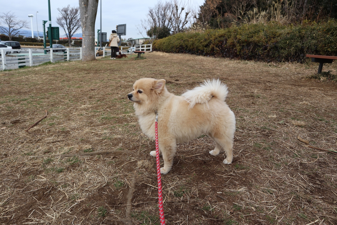 駐車場から建物正面にひだり左手側(東京方面側)に、ワンちゃんのお散歩エリアがあり助かります。幅10m、長さ50mくらいのエリアですが、地面は天然芝で、草木も生えています。トイレをしても、ワンちゃん専用のごみ箱も設置されているのも有難い限りです。
