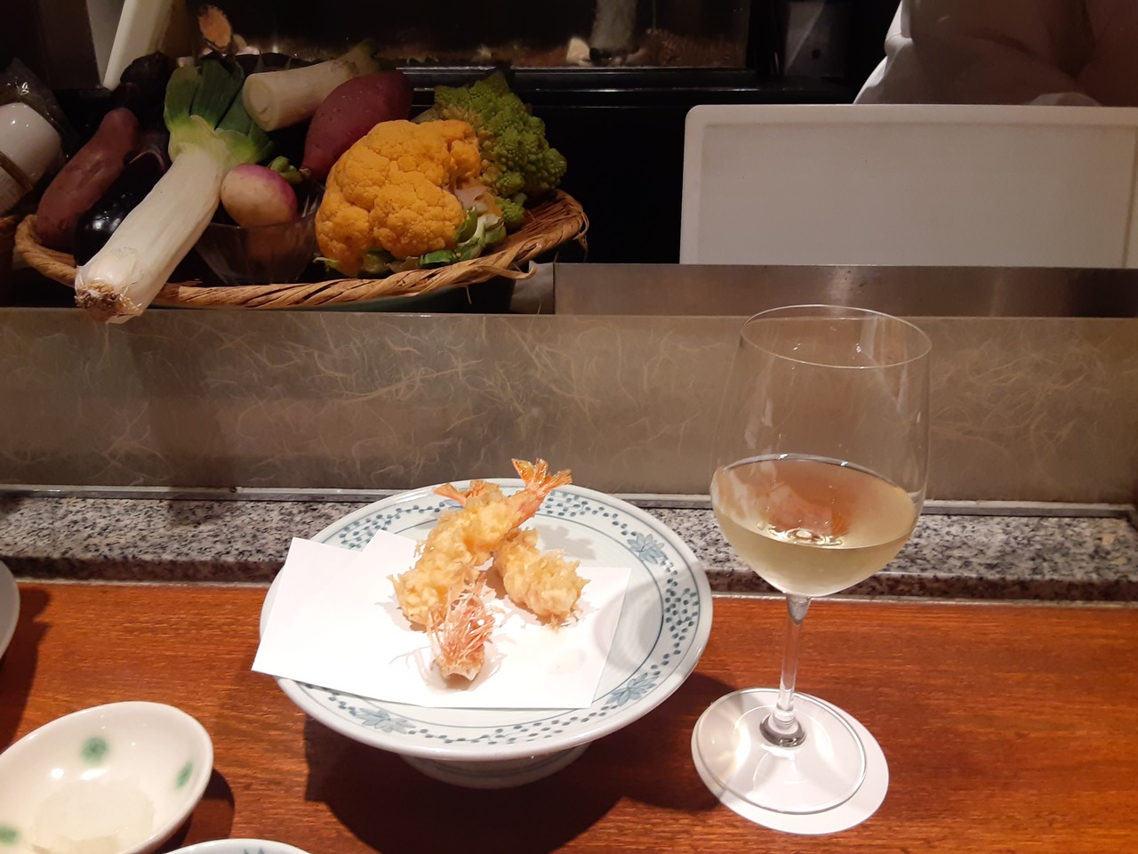 カウンター席で、天ぷらのお任せコースを堪能しました。通常のセットメニューだと、少し量が少ない印象ですが、今回は品数も多く大満足。目の前で、素材を紹介してくれた後、天ぷらを揚げてくれて、目や耳でも楽しめました。