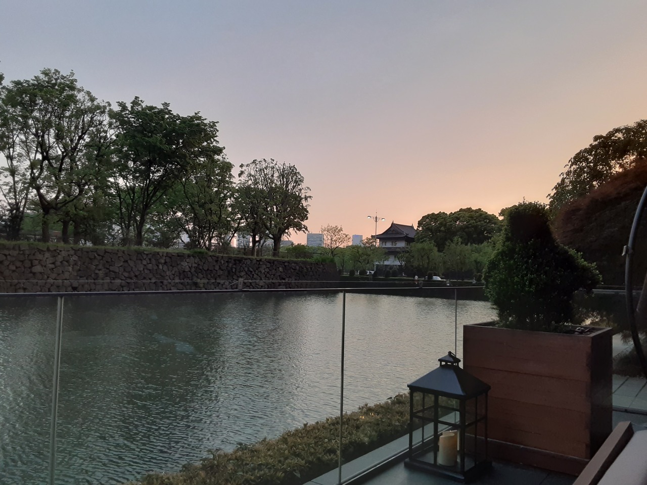 パレスホテルのグランドフロアにあるレストラン。おすすめはテラス席。皇居のお濠横にあり、都心にいるとは思えない静けさ。皇居横なので、高い建物がなく眺望もよいです。4人でアラカルト+ワイン2本+デザートで4万円強。このご時世、密を避けながら気持ち良く食事が楽しめました。