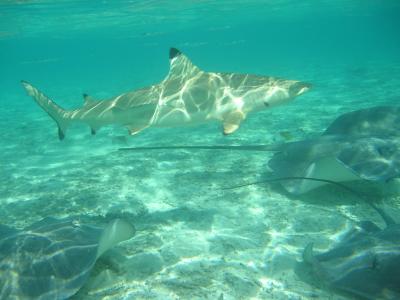 ヒルトンの近くの、エイとサメが集まるエリアに行きました。浅瀬では、エサ待ちのサメがウヨウヨ。体長は1メートル前後のブラックチップです。同じく1メートル近いエイも足元を泳ぎ、ひれが足に当たります。慣れるまでは少し怖いかもしれませんが面白いです。