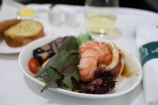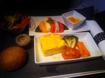 ビジネスクラスの利用です。座席はフルフラットシートになり、快適でした。食事は搭乗後すぐと、着陸前の2回。10時間ほどのフライトのわりに充実しています。カレー料理が絶品でした。客室乗務員もフレンドリーで親切。エンターテイメントも日本語メニューの揃えもまずまずでした。総じて快適でした。敢えて欠点を挙げれば、席周りに収納スペースが少ないことは、少し不便に感じました。