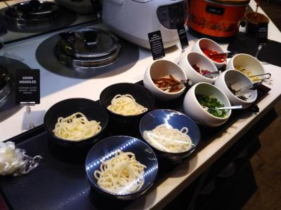 JAL指定のビジネスラウンジ。他の航空会社とも共用のため、いつも混雑気味。食事はビュッフェのみ。セルフでうどんと日本式のビーフカレーがあるので、うどんの上にカレーをかけてカレーうどんにして楽しみました。食事の他、シャワーブースもありました。